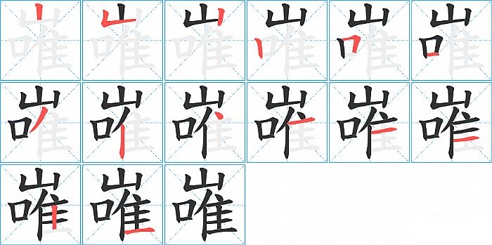 嶉是上下结构,嶉的部首是“山”,部外笔画11画,总笔画14画,嶉的笔画顺序是“竖、竖折/竖弯、竖、竖、横折、横、撇、竖、点、横、横、横、竖、横”。看看“嶉”字什么意思 >>