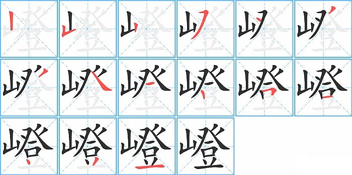 嶝是左右结构,嶝的部首是“山”,部外笔画12画,总笔画15画,嶝的笔画顺序是“竖、竖折/竖弯、竖、横撇/横钩、点、撇、撇、捺、横、竖、横折、横、点、撇、横”。看看“嶝”字什么意思 >>