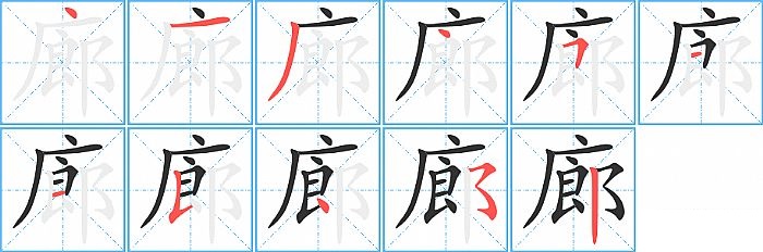 廊是半包围结构,廊的部首是“广”,部外笔画8画,总笔画11画,廊的笔画顺序是“点、横、撇、点、横折、横、横、竖提、点、横折折折钩/横撇弯钩、竖”。看看“廊”字什么意思 >>