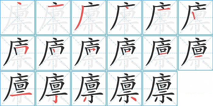 廪是半包围结构,廪的部首是“广”,部外笔画13画,总笔画16画,廪的笔画顺序是“点、横、撇、点、横、竖、横折、竖、横折、横、横、横、横、竖钩、撇、点”。看看“廪”字什么意思 >>
