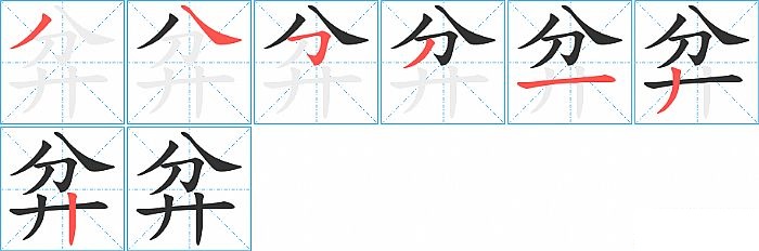 弅是上下结构,弅的部首是“廾”,部外笔画4画,总笔画7画,弅的笔画顺序是“撇、捺、横折钩、撇、横、撇、竖”。