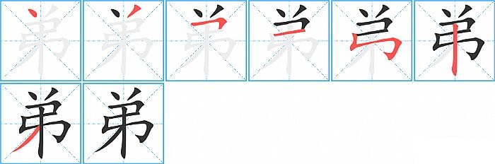 弟是单一结构,弟的部首是“弓”,部外笔画4画,总笔画7画,弟的笔画顺序是“点、撇、横折、横、竖折折钩、竖、撇”。