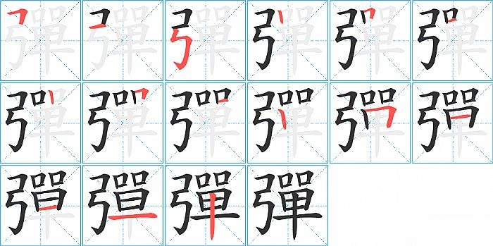 彈是左右结构,彈的部首是“弓”,部外笔画12画,总笔画15画,彈的笔画顺序是“横折、横、竖折折钩、竖、横折、横、竖、横折、横、竖、横折、横、横、横、竖”。看看“彈”字什么意思 >>
