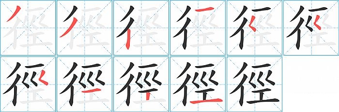 徑是左右结构,徑的部首是“彳”,部外笔画7画,总笔画10画,徑的笔画顺序是“撇、撇、竖、横、撇点、撇点、撇点、横、竖、横”。看看“徑”字什么意思 >>