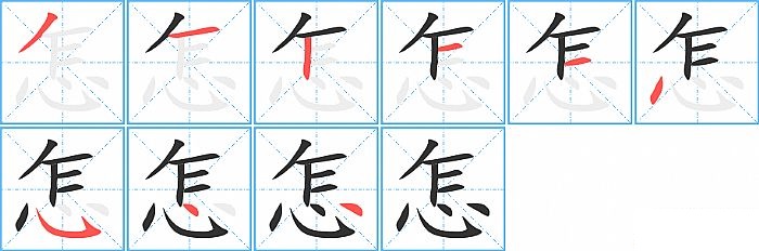 怎是上下结构,怎的部首是“心”,部外笔画5画,总笔画9画,怎的笔画顺序是“撇、横、竖、横、横、点、斜钩、点、点”。