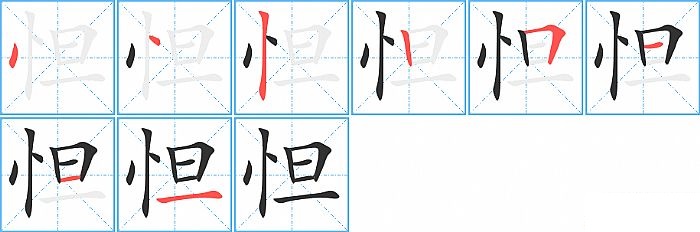 怛是左右结构,怛的部首是“忄”,部外笔画5画,总笔画8画,怛的笔画顺序是“点、点、竖、竖、横折、横、横、横”。