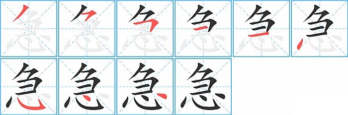 急是上下结构,急的部首是“心”,部外笔画5画,总笔画9画,急的笔画顺序是“撇、横撇/横钩、横折、横、横、点、斜钩、点、点”。看看“急”字什么意思 >>