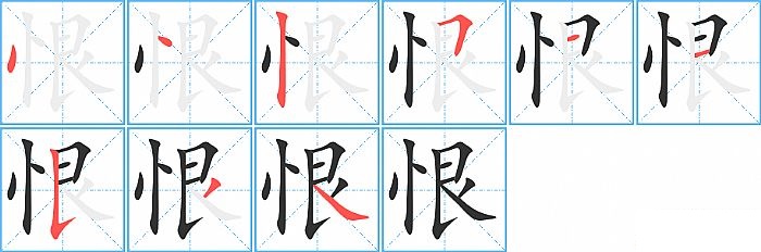 《恨》字的笔顺分步演示图(一笔一画写汉字)