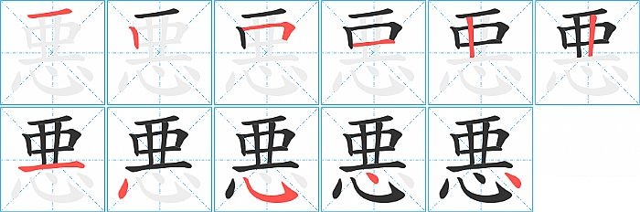 悪是上下结构,悪的部首是“心”,部外笔画7画,总笔画11画,悪的笔画顺序是“横、竖、横折、横、竖、竖、横、点、斜钩、点、点”。看看“悪”字什么意思 >>