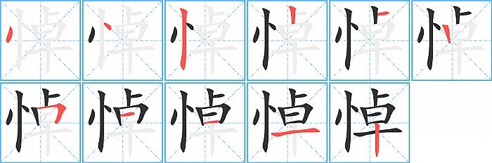 悼是左右结构,悼的部首是“忄”,部外笔画8画,总笔画11画,悼的笔画顺序是“点、点、竖、竖、横、竖、横折、横、横、横、竖”。看看“悼”字什么意思 >>
