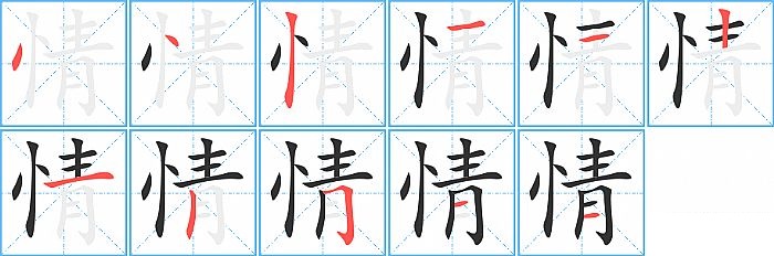 情是左右结构,情的部首是“忄”,部外笔画8画,总笔画11画,情的笔画顺序是“点、点、竖、横、横、竖、横、竖、横折钩、横、横”。看看“情”字什么意思 >>
