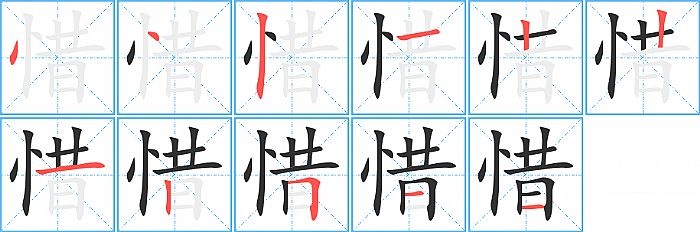 惜是左右结构,惜的部首是“忄”,部外笔画8画,总笔画11画,惜的笔画顺序是“点、点、竖、横、竖、竖、横、竖、横折、横、横”。看看“惜”字什么意思 >>