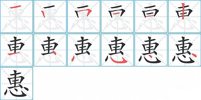 惠是上下结构,惠的部首是“心”,部外笔画8画,总笔画12画,惠的笔画顺序是“横、竖、横折、横、横、竖、横、点、点、斜钩、点、点”。看看“惠”字什么意思 >>