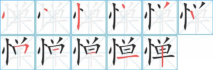 惮是左右结构,惮的部首是“忄”,部外笔画8画,总笔画11画,惮的笔画顺序是“点、点、竖、点、撇、竖、横折、横、横、横、竖”。看看“惮”字什么意思 >>