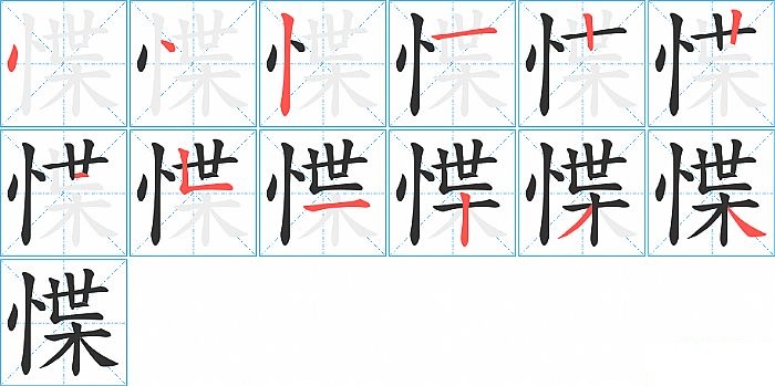 惵是左右结构,惵的部首是“忄”,部外笔画9画,总笔画12画,惵的笔画顺序是“点、点、竖、横、竖、竖、横、竖折/竖弯、横、竖、撇、捺”。看看“惵”字什么意思 >>