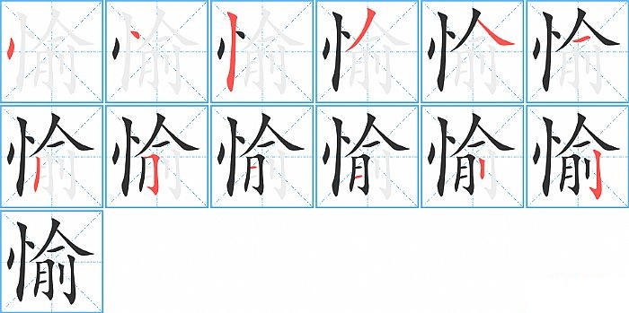 愉是左右结构,愉的部首是“忄”,部外笔画9画,总笔画12画,愉的笔画顺序是“点、点、竖、撇、捺、横、竖、横折钩、横、横、竖、竖钩”。看看“愉”字什么意思 >>