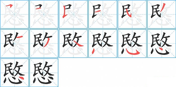 愍是上下结构,愍的部首是“心”,部外笔画9画,总笔画13画,愍的笔画顺序是“横折、横、竖提、横、斜钩、撇、横、撇、捺、点、斜钩、点、点”。看看“愍”字什么意思 >>
