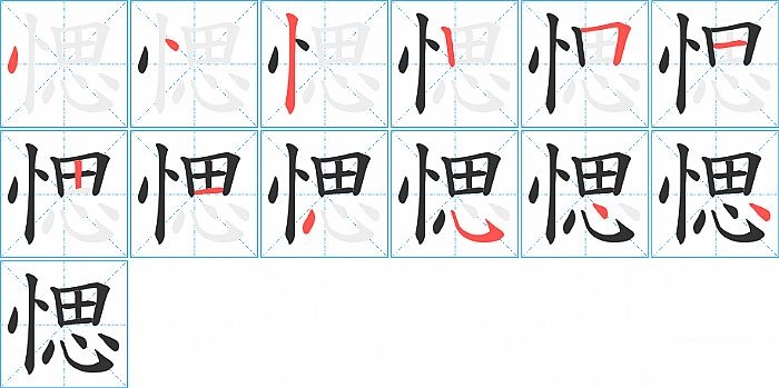 愢是左右结构,愢的部首是“忄”,部外笔画9画,总笔画12画,愢的笔画顺序是“点、点、竖、竖、横折、横、竖、横、点、斜钩、点、点”。看看“愢”字什么意思 >>