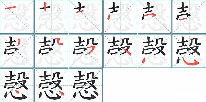 愨是上下结构,愨的部首是“心”,部外笔画10画,总笔画14画,愨的笔画顺序是“横、竖、横、点、横撇/横钩、横、撇、横折折/横折弯、横撇/横钩、捺、点、斜钩、点、点”。看看“愨”字什么意思 >>