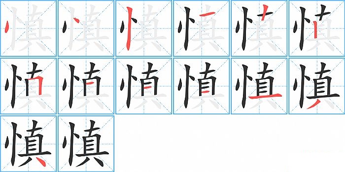 慎是左右结构,慎的部首是“忄”,部外笔画10画,总笔画13画,慎的笔画顺序是“点、点、竖、横、竖、竖、横折、横、横、横、横、撇、点”。看看“慎”字什么意思 >>