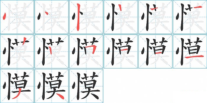 慔是左右结构,慔的部首是“忄”,部外笔画10画,总笔画13画,慔的笔画顺序是“点、点、竖、横、竖、竖、竖、横折、横、横、横、撇、捺”。看看“慔”字什么意思 >>