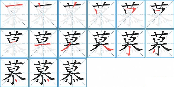 慕是上下结构,慕的部首是“小”,部外笔画11画,总笔画14画,慕的笔画顺序是“横、竖、竖、竖、横折、横、横、横、撇、捺、竖钩、点、点、点”。看看“慕”字什么意思 >>