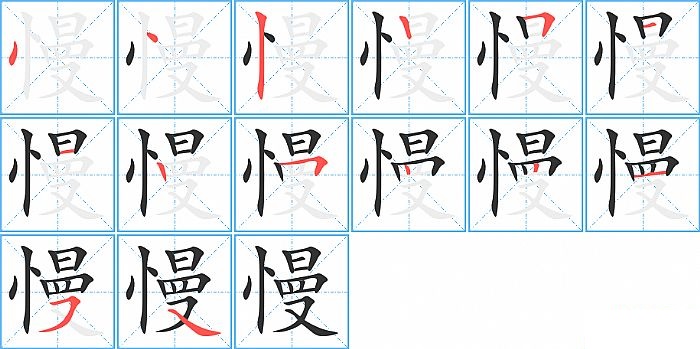 慢是左右结构,慢的部首是“忄”,部外笔画11画,总笔画14画,慢的笔画顺序是“点、点、竖、竖、横折、横、横、竖、横折、竖、竖、横、横撇/横钩、捺”。看看“慢”字什么意思 >>