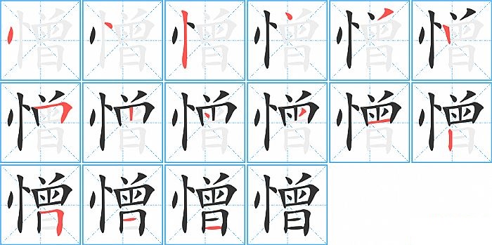 憎是左右结构,憎的部首是“忄”,部外笔画12画,总笔画15画,憎的笔画顺序是“点、点、竖、点、撇、竖、横折、竖、点、撇、横、竖、横折、横、横”。看看“憎”字什么意思 >>