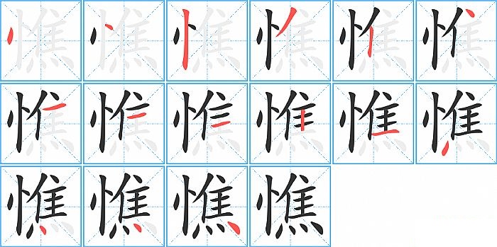 憔是左右结构,憔的部首是“忄”,部外笔画12画,总笔画15画,憔的笔画顺序是“点、点、竖、撇、竖、点、横、横、横、竖、横、点、点、点、点”。看看“憔”字什么意思 >>