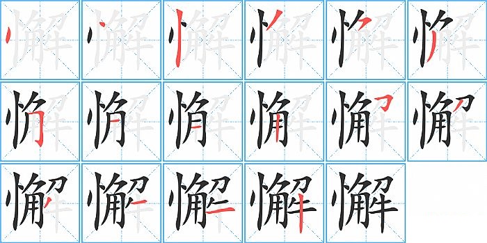 懈是左中右结构,懈的部首是“忄”,部外笔画13画,总笔画16画,懈的笔画顺序是“点、点、竖、撇、横撇/横钩、撇、横折钩、横、横、竖、横折钩、撇、撇、横、横、竖”。看看“懈”字什么意思 >>