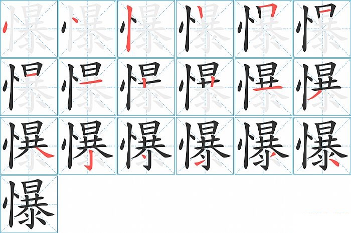 懪是左右结构,懪的部首是“忄”,部外笔画15画,总笔画18画,懪的笔画顺序是“点、点、竖、竖、横折、横、横、横、竖、竖、横、撇、捺、竖钩、点、提、撇、点”。看看“懪”字什么意思 >>