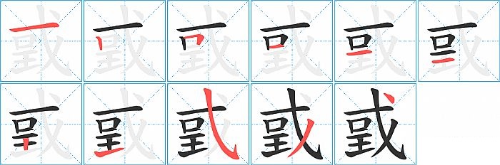 戜是右上包围结构,戜的部首是“戈”,部外笔画7画,总笔画11画,戜的笔画顺序是“横、竖、横折、横、横、横、竖、提、斜钩、撇、点”。看看“戜”字什么意思 >>
