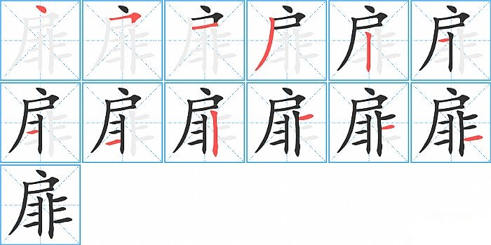 扉是半包围结构,扉的部首是“户”,部外笔画8画,总笔画12画,扉的笔画顺序是“点、横折、横、撇、竖、横、横、横、竖、横、横、横”。看看“扉”字什么意思 >>