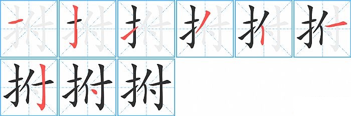 拊是左中右结构,拊的部首是“扌”,部外笔画5画,总笔画8画,拊的笔画顺序是“横、竖钩、提、撇、竖、横、竖钩、点”。