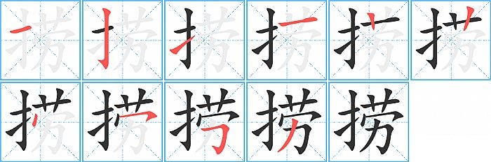 捞是左右结构,捞的部首是“扌”,部外笔画7画,总笔画10画,捞的笔画顺序是“横、竖钩、提、横、竖、竖、点、横撇/横钩、横折钩、撇”。看看“捞”字什么意思 >>