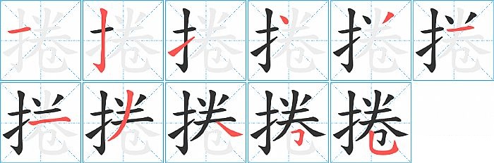 捲是左右结构,捲的部首是“扌”,部外笔画8画,总笔画11画,捲的笔画顺序是“横、竖钩、提、点、撇、横、横、撇、捺、横折钩、竖弯钩”。看看“捲”字什么意思 >>