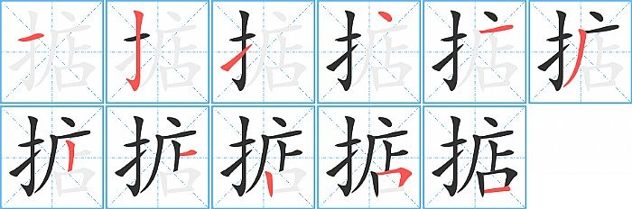 掂是左右结构,掂的部首是“扌”,部外笔画8画,总笔画11画,掂的笔画顺序是“横、竖钩、提、点、横、撇、竖、横、竖、横折、横”。看看“掂”字什么意思 >>
