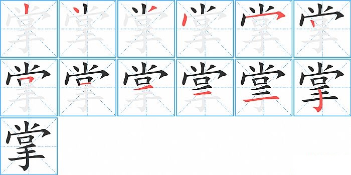 掌是上下结构,掌的部首是“手”,部外笔画8画,总笔画12画,掌的笔画顺序是“竖、点、撇、点、横撇/横钩、竖、横折、横、撇、横、横、竖钩”。看看“掌”字什么意思 >>