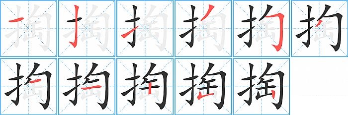 掏是左右结构,掏的部首是“扌”,部外笔画8画,总笔画11画,掏的笔画顺序是“横、竖钩、提、撇、横折钩、撇、横、横、竖、竖折/竖弯、竖”。看看“掏”字什么意思 >>