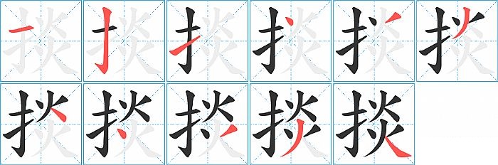 掞是左右结构,掞的部首是“扌”,部外笔画8画,总笔画11画,掞的笔画顺序是“横、竖钩、提、点、撇、撇、点、点、撇、撇、捺”。看看“掞”字什么意思 >>