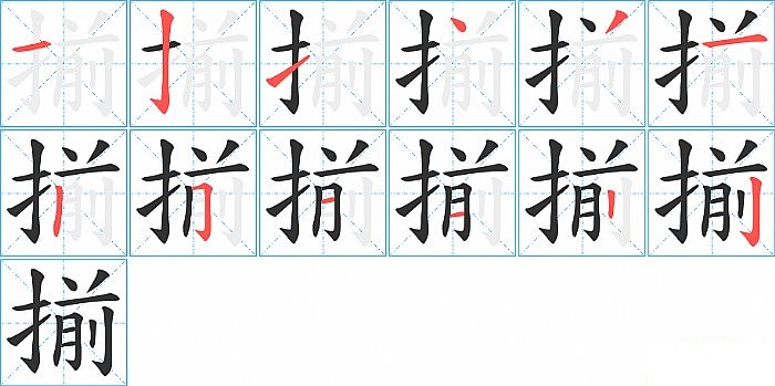 揃是左右结构,揃的部首是“扌”,部外笔画9画,总笔画12画,揃的笔画顺序是“横、竖钩、提、点、撇、横、竖、横折钩、横、横、竖、竖钩”。看看“揃”字什么意思 >>