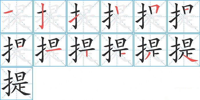 提是左右结构,提的部首是“扌”,部外笔画9画,总笔画12画,提的笔画顺序是“横、竖钩、提、竖、横折、横、横、横、竖、横、撇、捺”。看看“提”字什么意思 >>