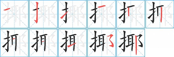 揶是左中右结构,揶的部首是“扌”,部外笔画8画,总笔画11画,揶的笔画顺序是“横、竖钩、提、横、竖、竖、横、横、提、横折折折钩/横撇弯钩、竖”。看看“揶”字什么意思 >>