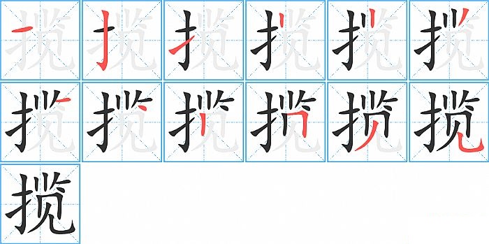 揽是左右结构,揽的部首是“扌”,部外笔画9画,总笔画12画,揽的笔画顺序是“横、竖钩、提、竖、竖、撇、横、点、竖、横折、撇、竖弯钩”。看看“揽”字什么意思 >>