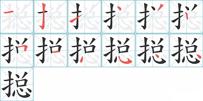 搃是左右结构,搃的部首是“扌”,部外笔画9画,总笔画12画,搃的笔画顺序是“横、竖钩、提、点、撇、竖、横折、横、点、斜钩、点、点”。看看“搃”字什么意思 >>