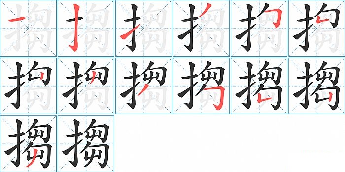 搊是左右结构,搊的部首是“扌”,部外笔画10画,总笔画13画,搊的笔画顺序是“横、竖钩、提、撇、横折钩、竖折/竖弯、竖、撇、撇、横折钩、竖折/竖弯、竖、撇”。看看“搊”字什么意思 >>