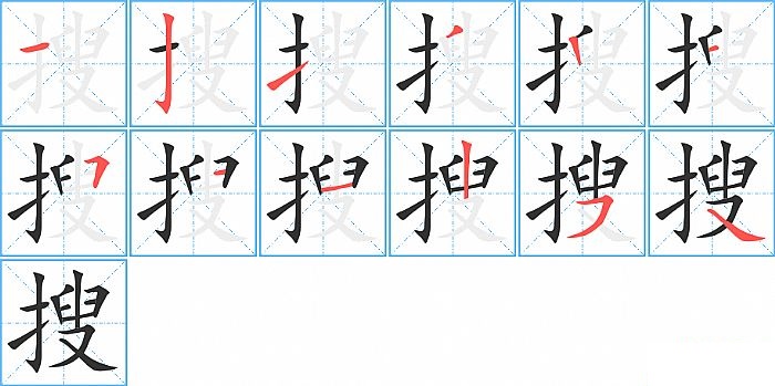搜是左右结构,搜的部首是“扌”,部外笔画9画,总笔画12画,搜的笔画顺序是“横、竖钩、提、撇、竖、横、横折、横、横、竖、横撇/横钩、捺”。看看“搜”字什么意思 >>
