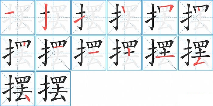 摆是左右结构,摆的部首是“扌”,部外笔画10画,总笔画13画,摆的笔画顺序是“横、竖钩、提、竖、横折、竖、竖、横、横、竖、横、撇折、点”。看看“摆”字什么意思 >>