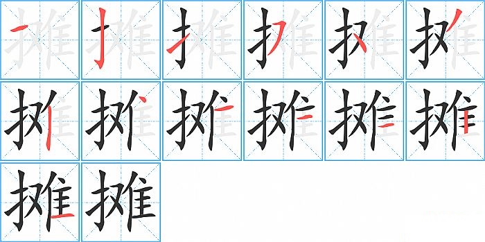摊是左中右结构,摊的部首是“扌”,部外笔画10画,总笔画13画,摊的笔画顺序是“横、竖钩、提、横撇/横钩、点、撇、竖、点、横、横、横、竖、横”。看看“摊”字什么意思 >>