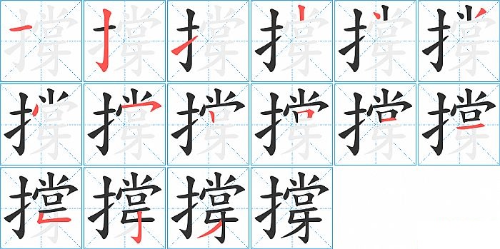 撐是左右结构,撐的部首是“扌”,部外笔画12画,总笔画15画,撐的笔画顺序是“横、竖钩、提、竖、点、撇、点、横撇/横钩、竖、横折、横、横、撇折、竖钩、撇”。看看“撐”字什么意思 >>